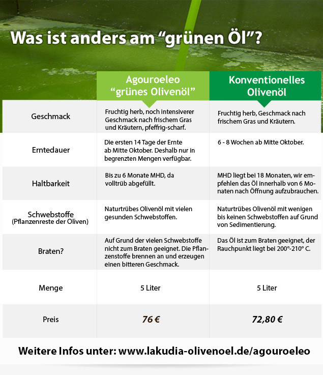 Das grüne Öl ist normalerweise in Deutschland schwer erhältlich, da die Olivenbauern dieses meist für den eigenen Gebrauch produzieren. Dies liegt an den Oliven für das grüne Öl Agoureleo, welche aus den Oliven der ersten zwei Erntewochen stammen. Die Ölmenge ist demnach begrenzt. Die noch unreifen Oliven enthalten mehr gesunde „Polyphenole“ als reife Oliven. Olivenölkenner schätzen diese Scharf- und Bitterstoffe geschmacklich sehr.
